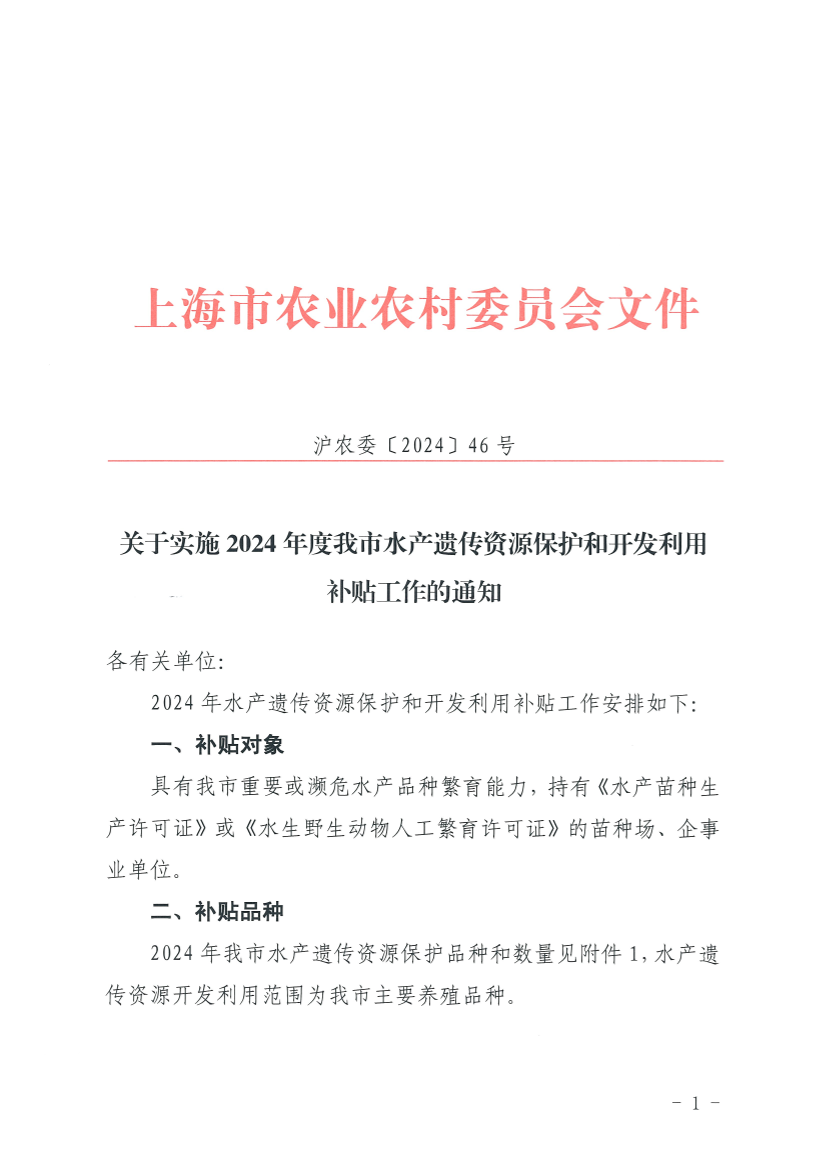 1. 水产遗传资源保护:根据《关于印发<上海市农业种质资源保护资金管理细则>的通知》(沪农委规〔2023〕16号)补贴标准实施。