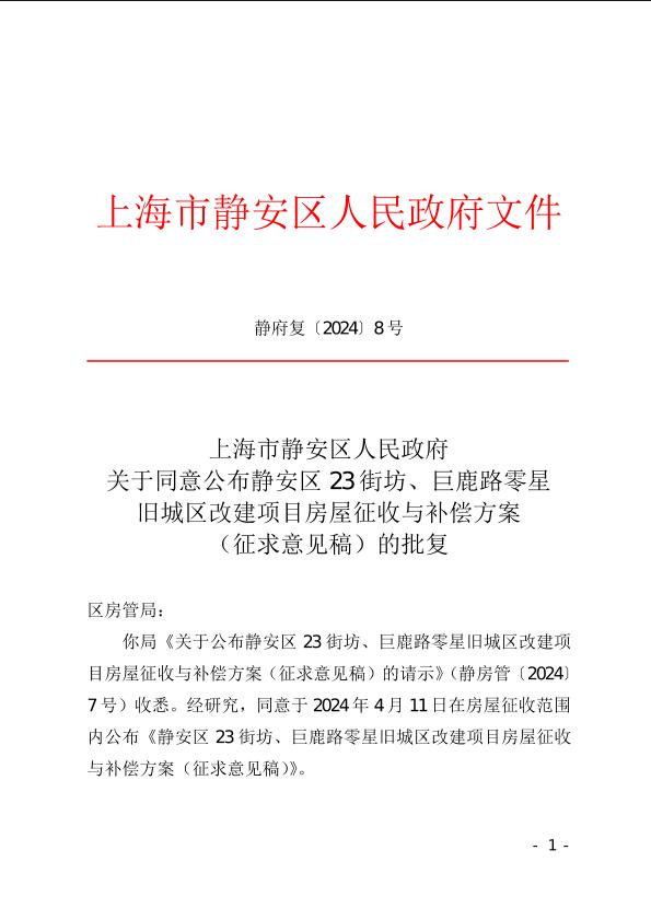 你局《关于公布静安区23街坊、巨鹿路零星旧城区改建项目房屋征收与补偿方案(征求意见稿)的请示》(静房管〔2024〕7号)收悉。经研究,同意于2024年4月11日在房屋征收范围内公布《静安区23街坊、巨鹿路零星旧城区改建项目房屋征收与补偿方案(征求意见稿)》。