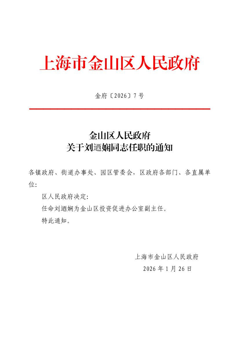 任命刘迺娴为金山区投资促进办公室副主任。