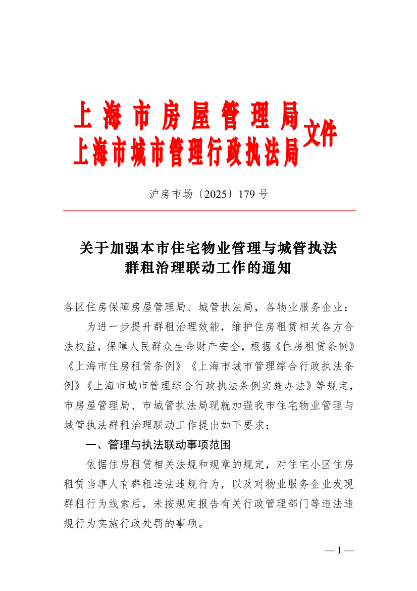 为进一步提升群租治理效能,维护住房租赁相关各方合法权益,保障人民群众生命财产安全,根据《住房租赁条例》《上海市住房租赁条例》《上海市城市管理综合行政执法条例》《上海市城市管理综合行政执法条例实施办法》等规定,市房屋管理局、市城管执法局现就加强我市住宅物业管理与城管执法群租治理联动工作提出如下要求: