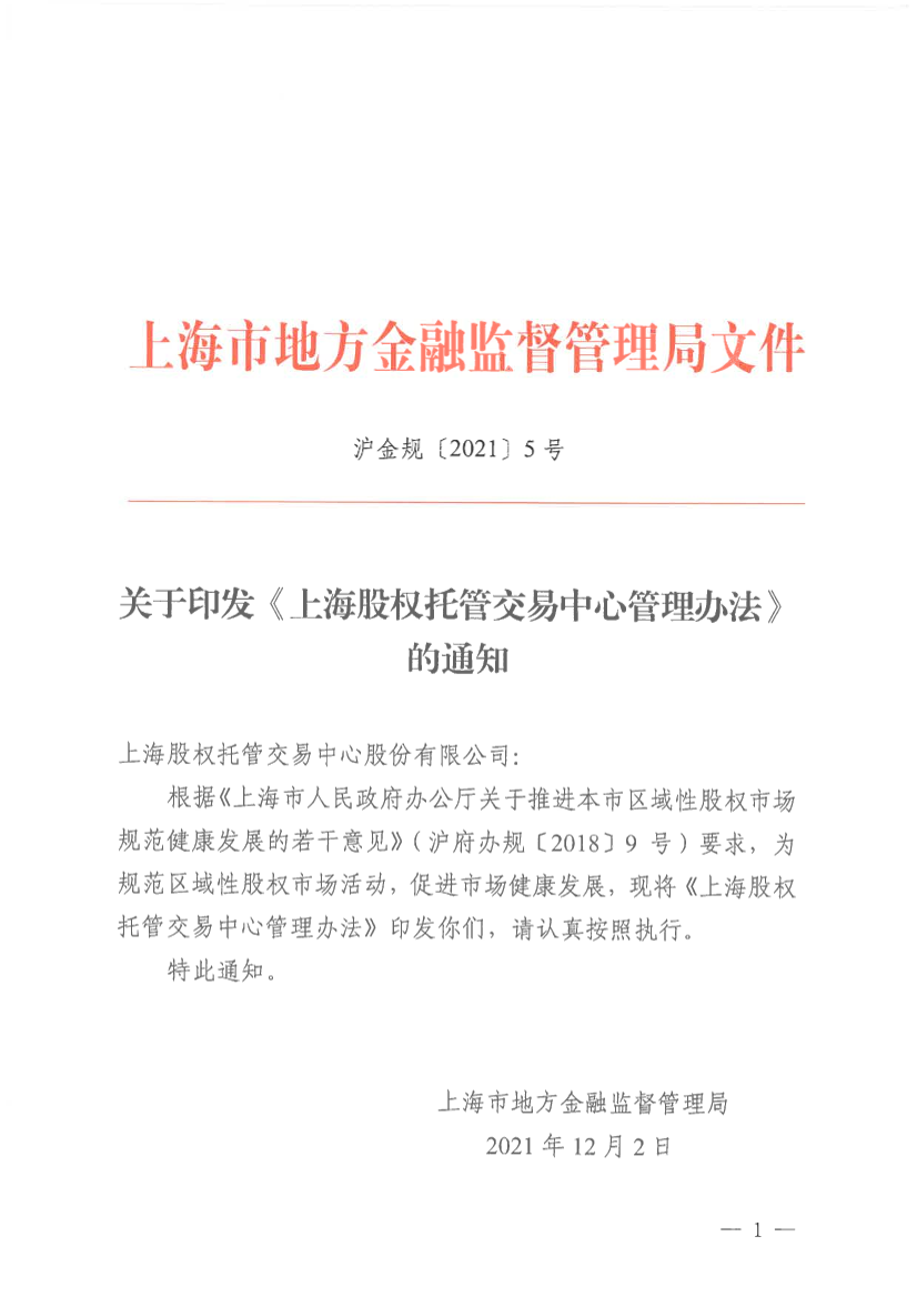 根据《上海市人民政府办公厅关于推进本市区域性股权市场规范健康发展的若干意见》(沪府办规〔2018〕9号)要求,为规范区域性股权市场活动,促进市场健康发展,现将《上海股权托管交易中心管理办法》印发你们,请认真按照执行。