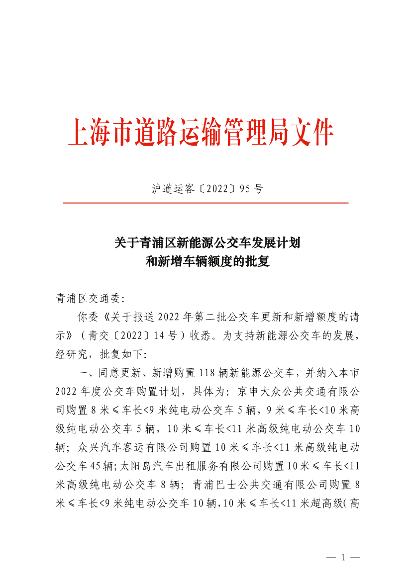 一、同意更新、新增购置118辆新能源公交车,并纳入本市2022年度公交车购置计划,具体为:京申大众公共交通有限公司购置8米≤车长<9米纯电动公交车5辆,9米≤车长<10米高级纯电动公交车5辆,10米≤车长<11米高级纯电动公交车10辆;众兴汽车客运有限公司购置10米≤车长<11米高级纯电动公交车45辆;太阳岛汽车出租服务有限公司购置10米≤车长<11米高级纯电动公交车8辆;青浦巴士公共交通有限公司购置8米≤车长<9米纯电动公交车10辆,10米≤车长<11米超高级(高一级)纯电动公交车29辆,10米≤车长<11米氢燃料电池公交车6辆。