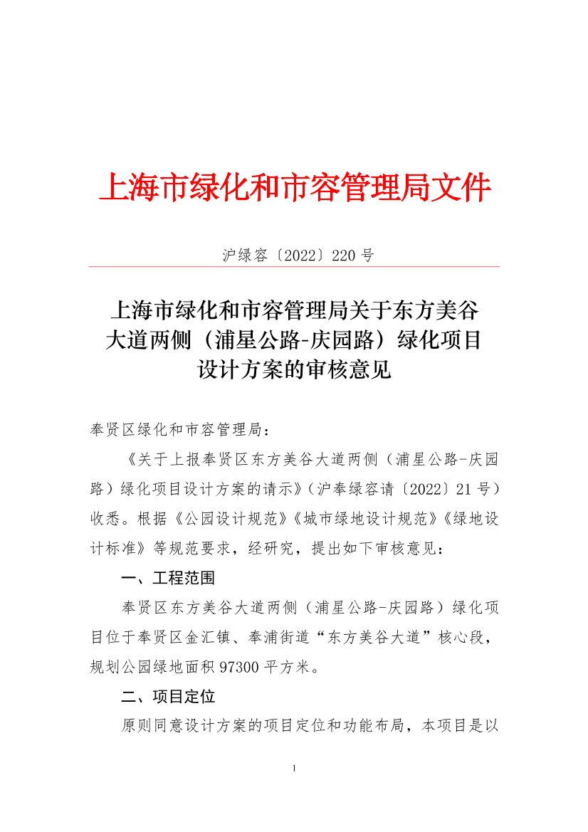 《关于上报奉贤区东方美谷大道两侧(浦星公路-庆园路)绿化项目设计方案的请示》(沪奉绿容请〔2022〕21号)收悉。根据《公园设计规范》《城市绿地设计规范》《绿地设计标准》等规范要求,经研究,提出如下审核意见: