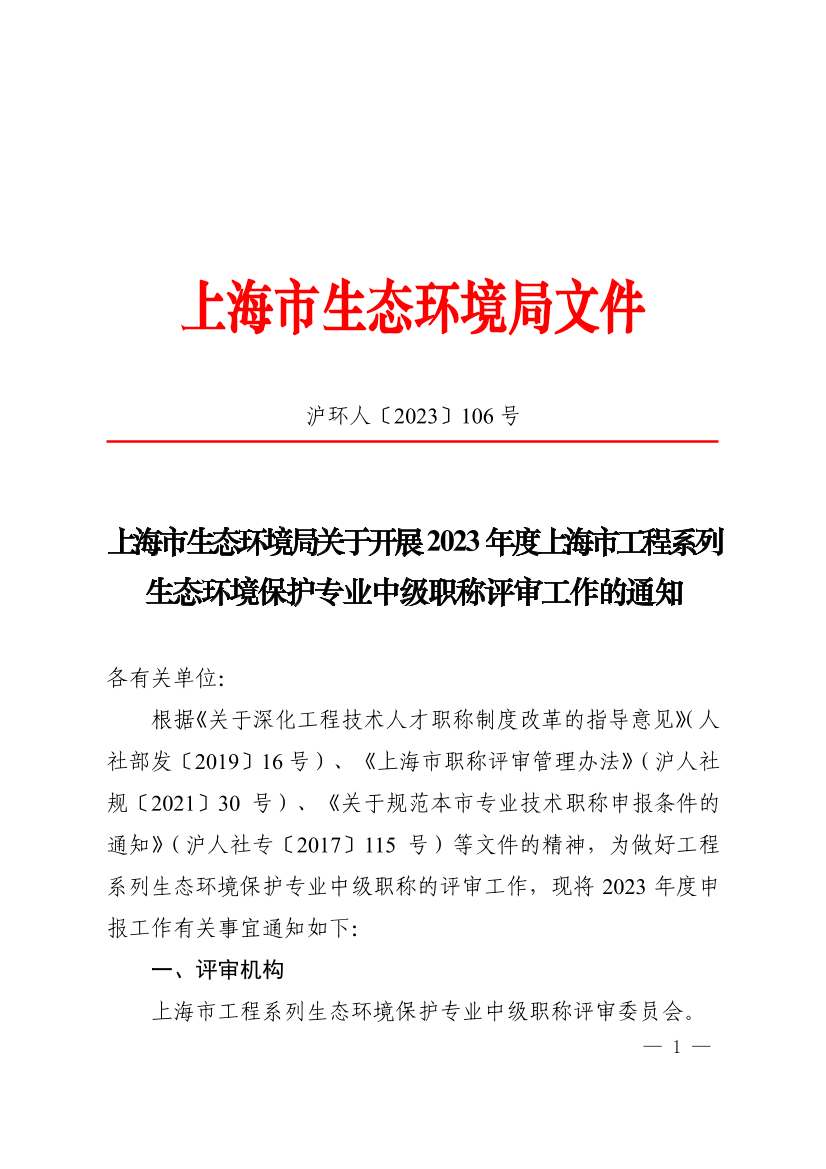 根据《关于深化工程技术人才职称制度改革的指导意见》(人社部发〔2019〕16号)、《上海市职称评审管理办法》(沪人社规〔2021〕30号)、《关于规范本市专业技术职称申报条件的通知》(沪人社专〔2017〕115号)等文件的精神,为做好工程系列生态环境保护专业中级职称的评审工作,现将2023年度申报工作有关事宜通知如下: