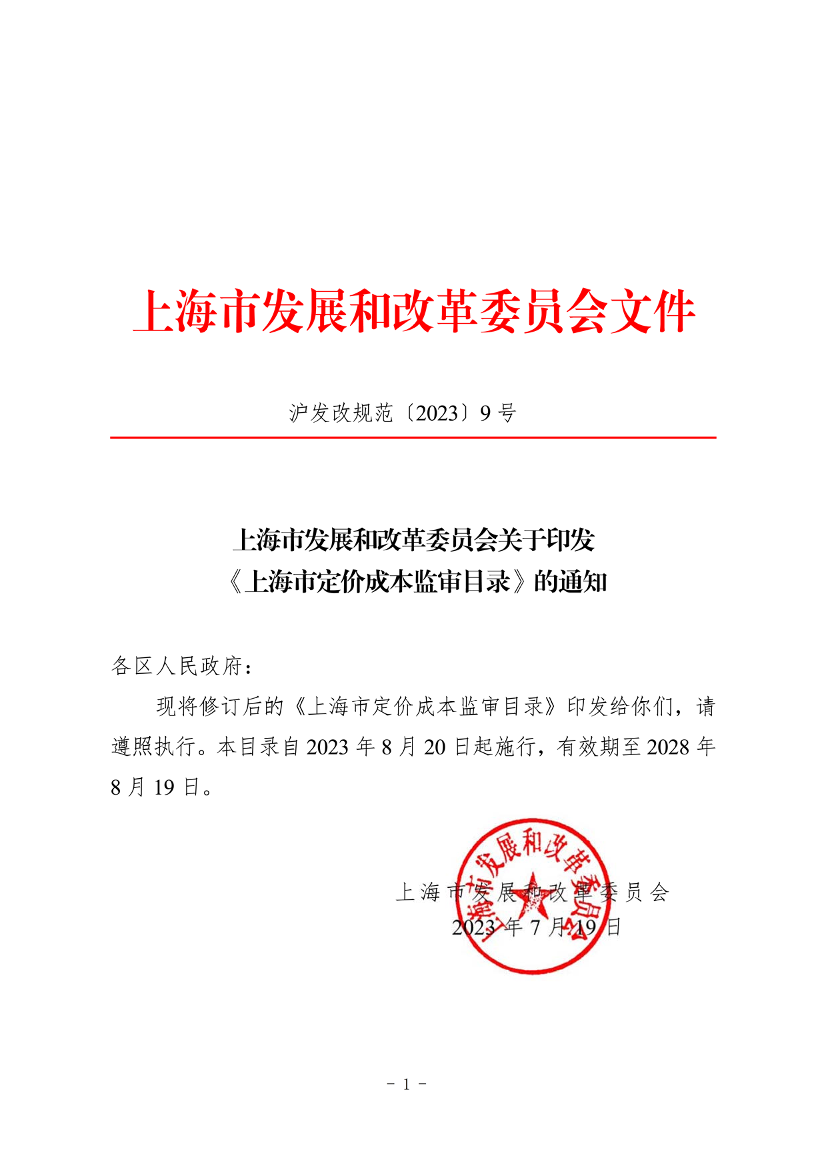 现将修订后的《上海市定价成本监审目录》印发给你们,请遵照执行。本目录自2023年8月20日起施行,有效期至2028年8月19日。