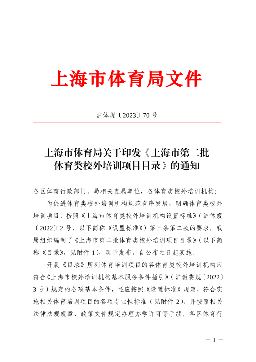 为促进体育类校外培训机构规范有序发展,明确体育类校外培训项目,按照《上海市体育类校外培训机构设置标准》(沪体规文〔2022〕2号,以下简称《设置标准》)第三条第二款的要求,我局组织编制了《上海市第二批体育类校外培训项目目录》(以下简称《目录》,见附件1),现予发布,自公布之日起实施。