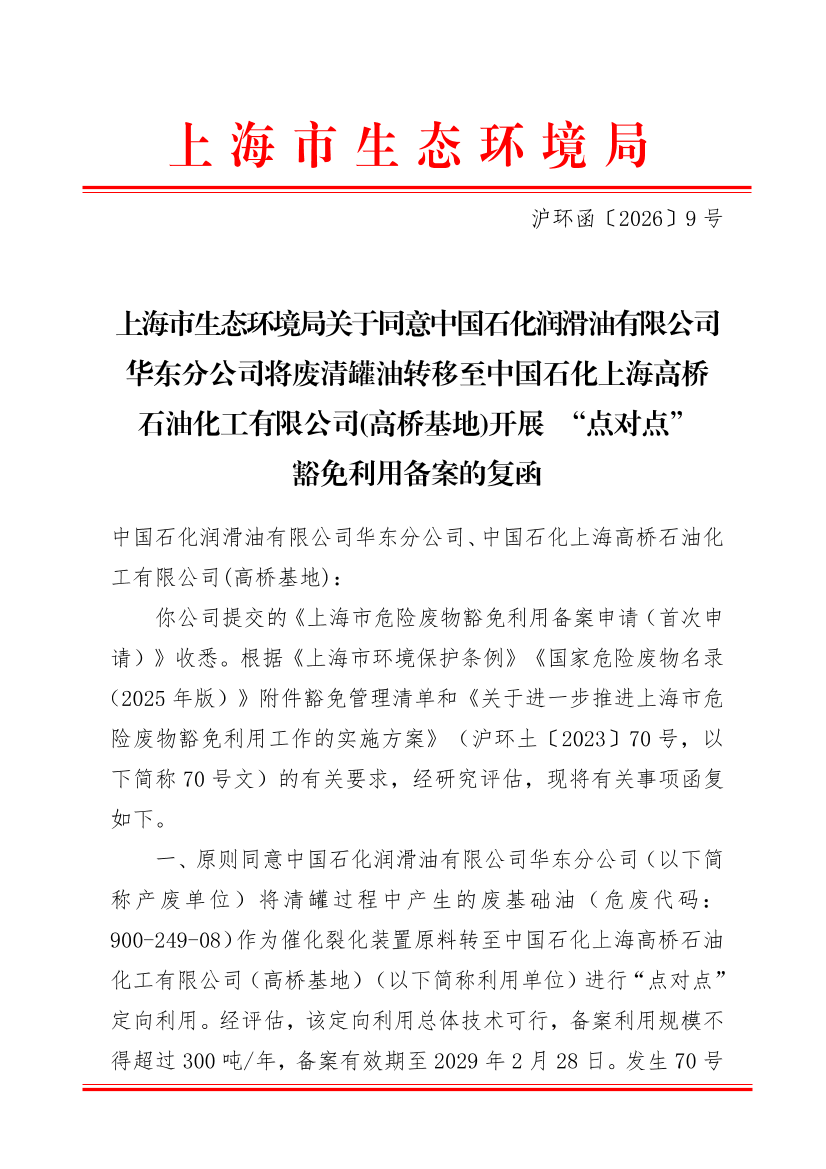 一、原则同意中国石化润滑油有限公司华东分公司(以下简称产废单位)将清罐过程中产生的废基础油(危废代码:900-249-08)作为催化裂化装置原料转至中国石化上海高桥石油化工有限公司(高桥基地)(以下简称利用单位)进行“点对点”定向利用。经评估,该定向利用总体技术可行,备案利用规模不得超过300吨/年,备案有效期至2029年2月28日。发生70号文中“变更”“重新申请”情形的,应按程序重新备案,未备案前不得利用。