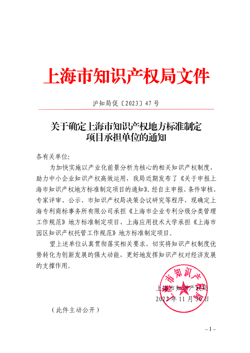 为加快实施以产业化前景分析为核心的相关知识产权制度,助力中小企业知识产权高效运用,我局近期发布了《关于申报上海市知识产权地方标准制定项目的通知》。经自主申报、条件审核、社会公示、市知识产权局局长办公会研究等程序,现确定上海专利商标事务所有限公司承担《上海市企业专利分级分类管理工作规范》地方标准制定项目、上海应用技术大学承担《上海市园区知识产权托管工作规范》地方标准制定项目。