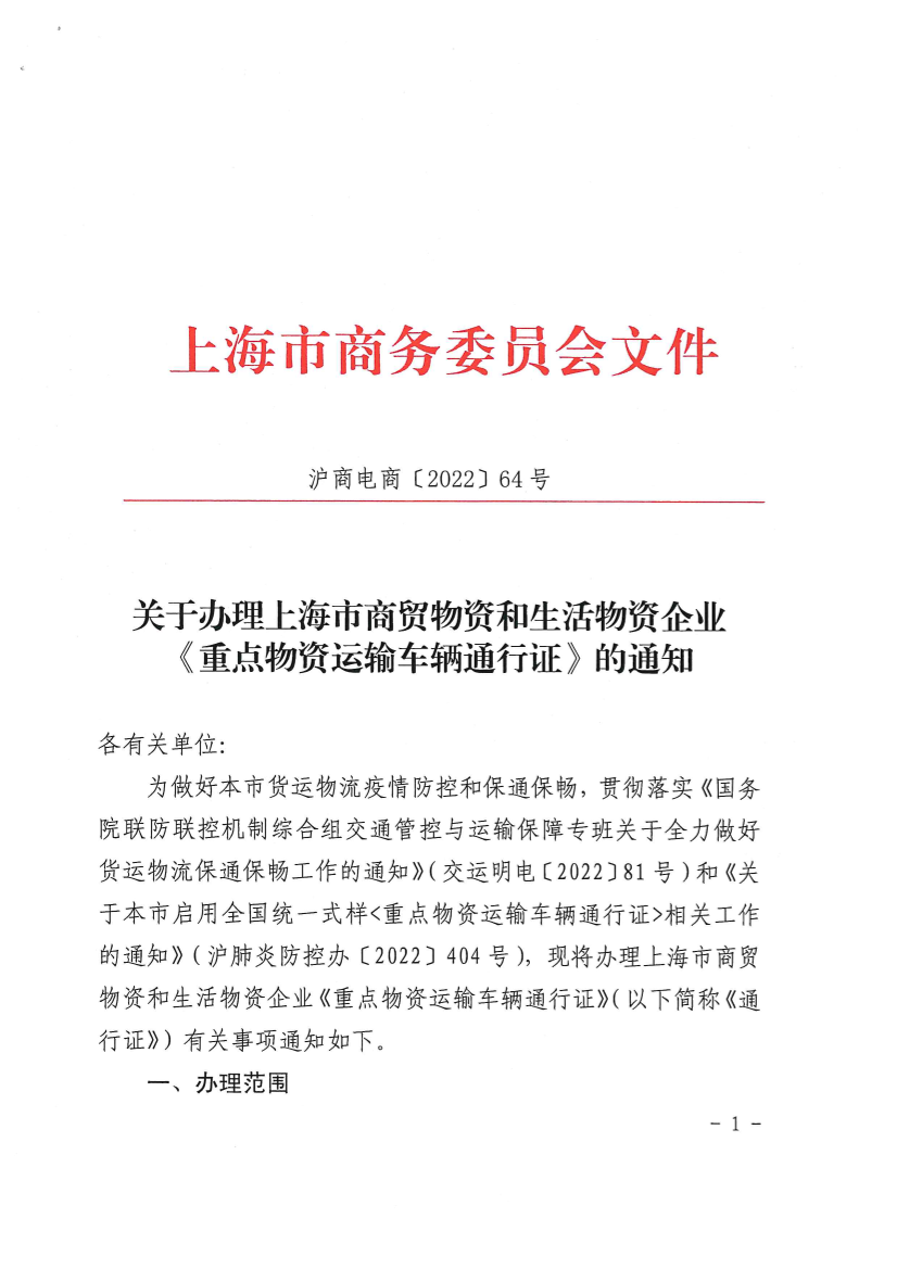 为做好本市货运物流疫情防控和保通保畅,贯彻落实《国务院联防联控机制综合组交通管控与运输保障专班关于全力做好货运物流保通保畅工作的通知》(交运明电〔2022〕81号)和《关于本市启用全国统一式样<重点物资运输车辆通行证>相关工作的通知》(沪肺炎防控办〔2022〕404号),现将办理上海市商贸物资和生活物资企业《重点物资运输车辆通行证》(以下简称《通行证》)有关事项通知如下。