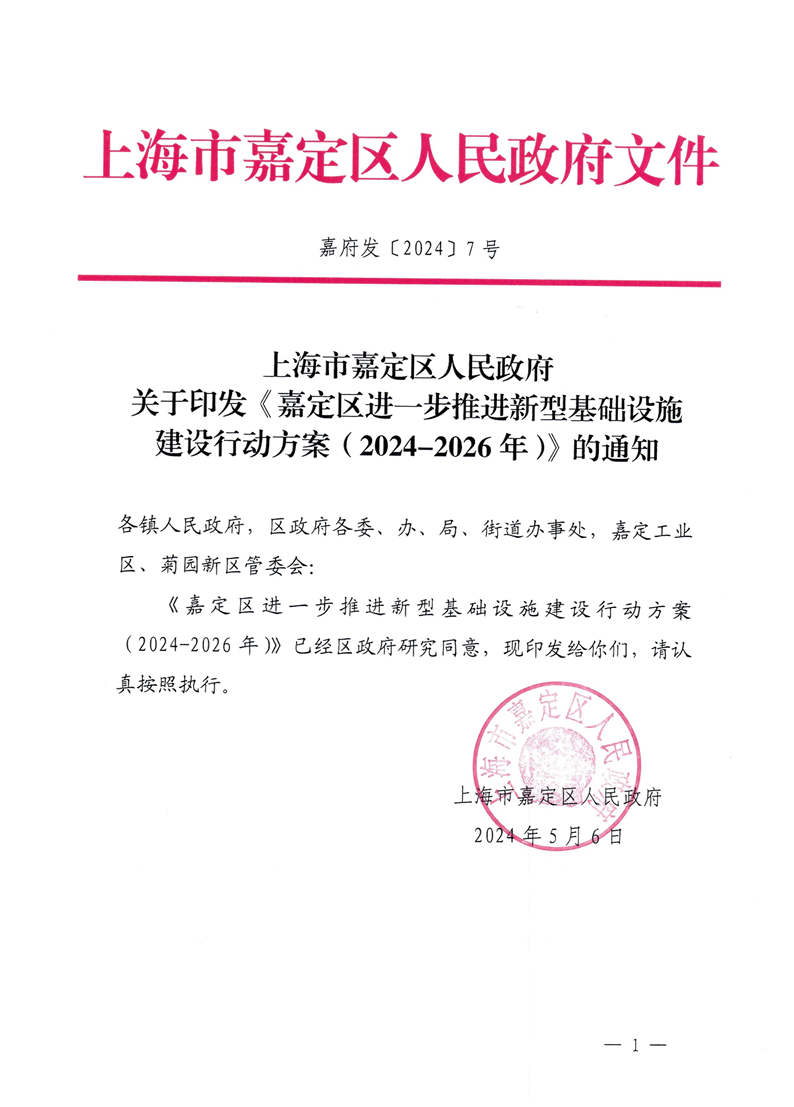 《嘉定区进一步推进新型基础设施建设行动方案(2024-2026年)》已经区政府研究同意,现印发给你们,请认真按照执行。
