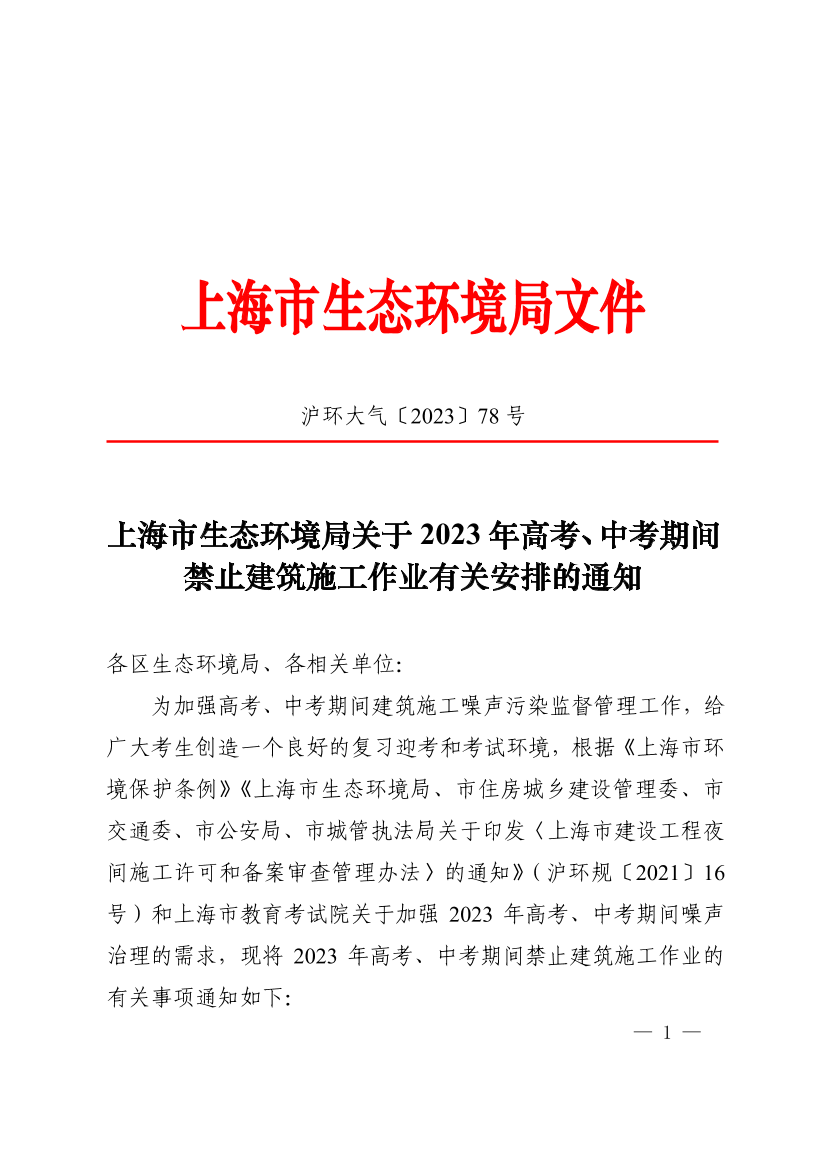 为加强高考、中考期间建筑施工噪声污染监督管理工作,给广大考生创造一个良好的复习迎考和考试环境,根据《上海市环境保护条例》《上海市生态环境局、市住房城乡建设管理委、市交通委、市公安局、市城管执法局关于印发〈上海市建设工程夜间施工许可和备案审查管理办法〉的通知》(沪环规〔2021〕16号)和上海市教育考试院关于加强2023年高考、中考期间噪声治理的需求,现将2023年高考、中考期间禁止建筑施工作业的有关事项通知如下: