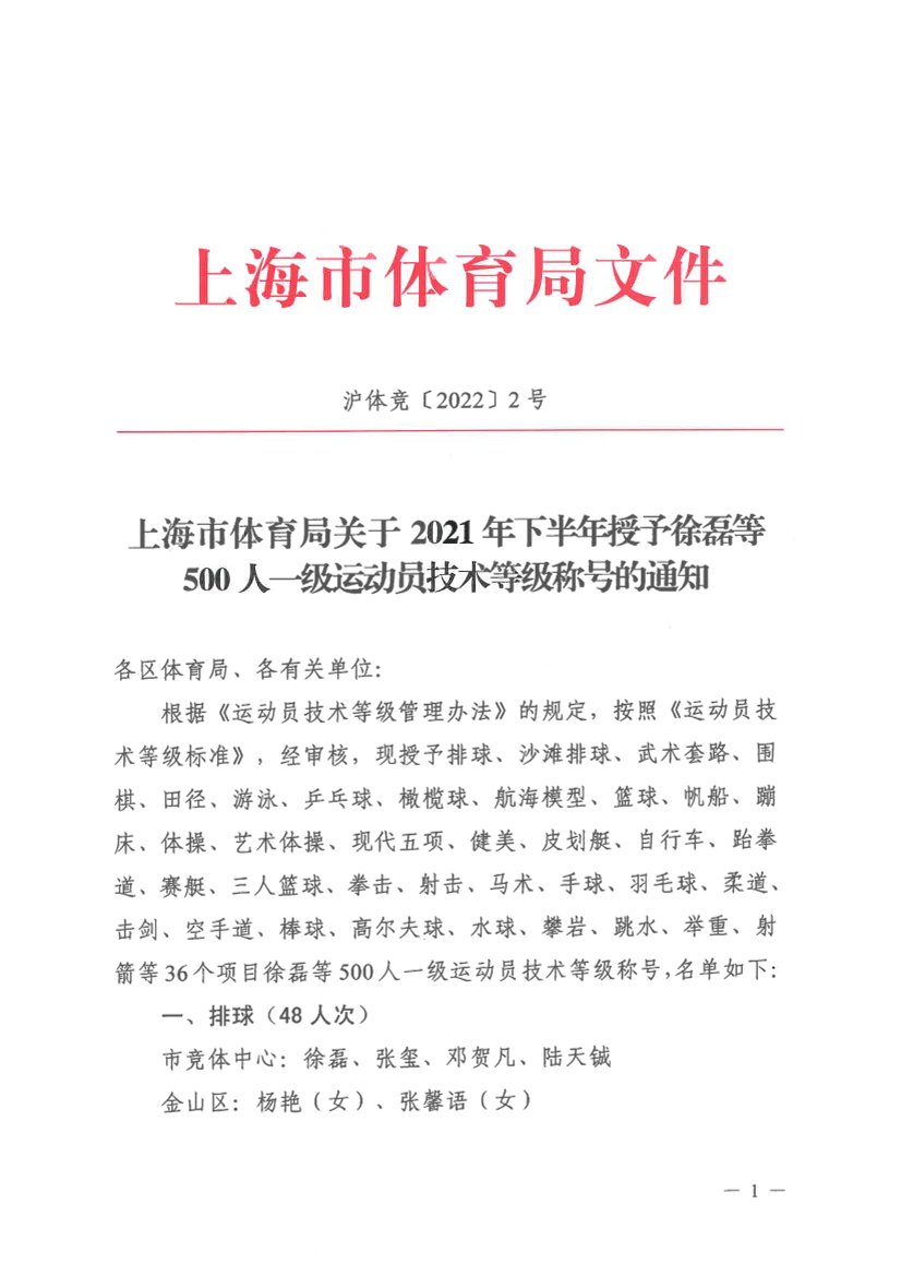 根据《运动员技术等级管理办法》的规定,按照《运动员技术等级标准》,经审核,现授予排球、沙滩排球、武术套路、围棋、田径、游泳、乒乓球、橄榄球、航海模型、篮球、帆船、蹦床、体操、艺术体操、现代五项、健美、皮划艇、自行车、跆拳道、赛艇、三人篮球、拳击、射击、马术、手球、羽毛球、柔道、击剑、空手道、棒球、高尔夫球、水球、攀岩、跳水、举重、射箭等36个项目徐磊等500人一级运动员技术等级称号,名单如下: