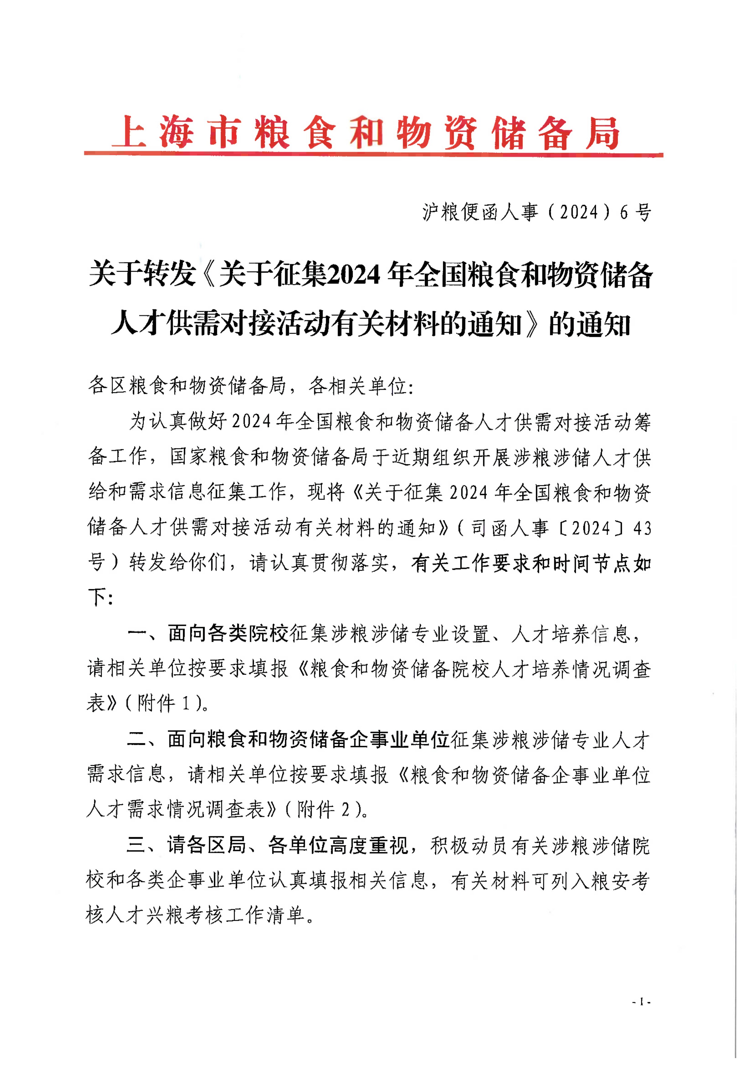 为认真做好2024年全国粮食和物资储备人才供需对接活动筹备工作,国家粮食和物资储备局于近期组织开展涉粮涉储人才供给和需求信息征集工作,现将《关于征集2024年全国粮食和物资储备人才供需对接活动有关材料的通知》(司函人事〔2024〕43号)转发给你们,请认真贯彻落实,有关工作要求和时间节点如下: