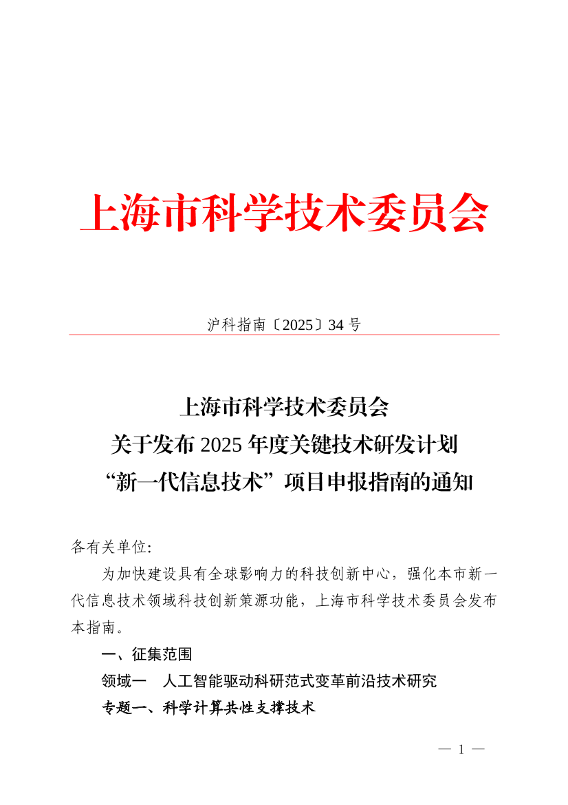 为加快建设具有全球影响力的科技创新中心,强化本市新一代信息技术领域科技创新策源功能,上海市科学技术委员会发布本指南。