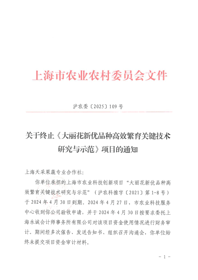 根据《上海市农业科技创新项目及资金管理细则(试行)》(以下简称“管理细则”)第二十一条,“不配合资金审计等严重违约行为的,追回项目已拨资金,阶段性或永久取消项目承担者项目申报资格”。现决定终止该项目实施,永久取消课题负责人“杨建平”农业科技创新项目申报资格,相关信息报送上海市科技信用信息平台。责令你单位限期返回项目已拨资金,于2025年5月31日前,将已拨付的50万元财政资金上缴至市农业农村委账户。
