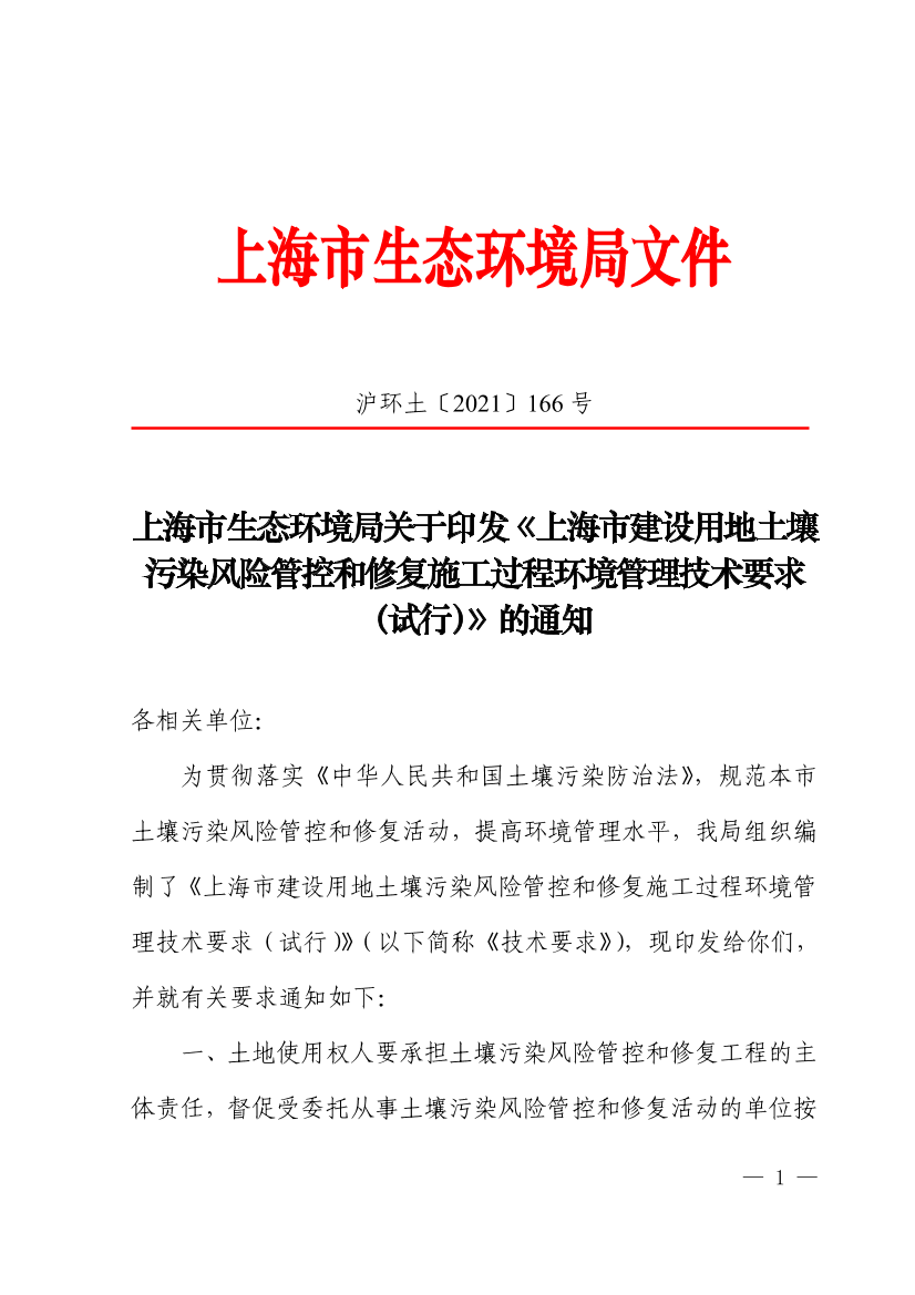 为贯彻落实《中华人民共和国土壤污染防治法》,规范本市土壤污染风险管控和修复活动,提高环境管理水平,我局组织编制了《上海市建设用地土壤污染风险管控和修复施工过程环境管理技术要求(试行)》(以下简称《技术要求》),现印发给你们,并就有关要求通知如下: