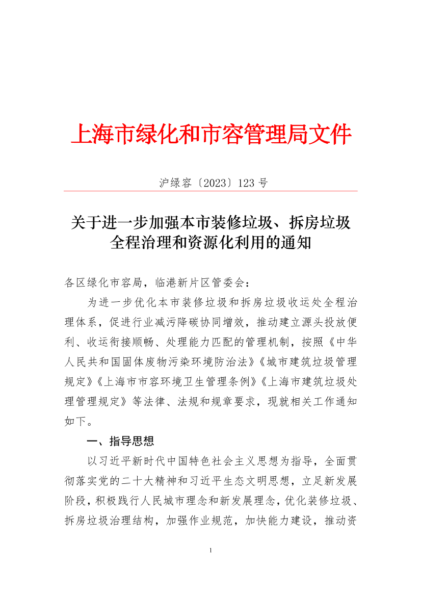 为进一步优化本市装修垃圾和拆房垃圾收运处全程治理体系,促进行业减污降碳协同增效,推动建立源头投放便利、收运衔接顺畅、处理能力匹配的管理机制,按照《中华人民共和国固体废物污染环境防治法》《城市建筑垃圾管理规定》《上海市市容环境卫生管理条例》《上海市建筑垃圾处理管理规定》等法律、法规和规章要求,现就相关工作通知如下。