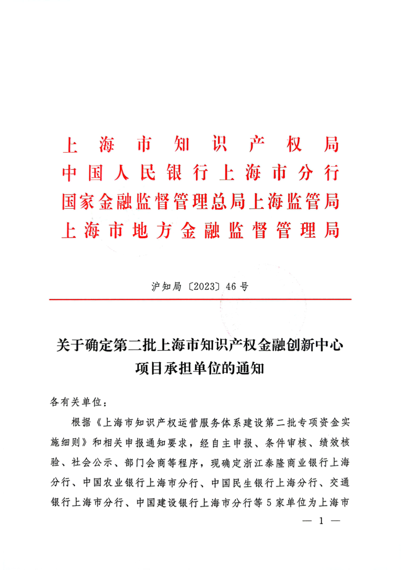 根据《上海市知识产权运营服务体系建设第二批专项资金实施细则》和相关申报通知要求,经自主申报、条件审核、绩效核验、社会公示、部门会商等程序,现确定浙江泰隆商业银行上海分行、中国农业银行上海市分行、中国民生银行上海分行、交通银行上海市分行、中国建设银行上海市分行等5家单位为上海市知识产权金融创新中心项目承担单位。