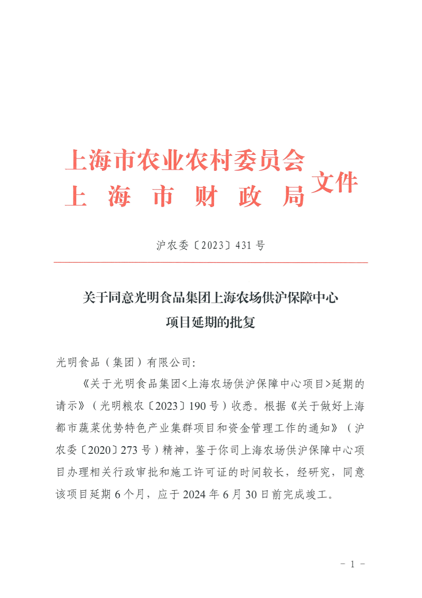 《关于光明食品集团<上海农场供沪保障中心项目>延期的请示》(光明粮农〔2023〕190号)收悉。根据《关于做好上海都市蔬菜优势特色产业集群项目和资金管理工作的通知》(沪农委〔2020〕273号)精神,鉴于你司上海农场供沪保障中心项目办理相关行政审批和施工许可证的时间较长,经研究,同意该项目延期6个月,应于2024年6月30日前完成竣工。