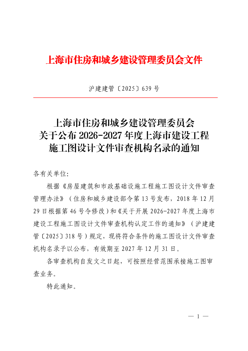 根据《房屋建筑和市政基础设施工程施工图设计文件审查管理办法》(住房和城乡建设部令第13号发布,2018年12月29日根据第46号令修改)和《关于开展2026-2027年度上海市建设工程施工图设计文件审查机构认定工作的通知》(沪建建管〔2025〕318号)规定,现将符合条件的施工图设计文件审查机构名录予以公布,有效期至2027年12月31日。