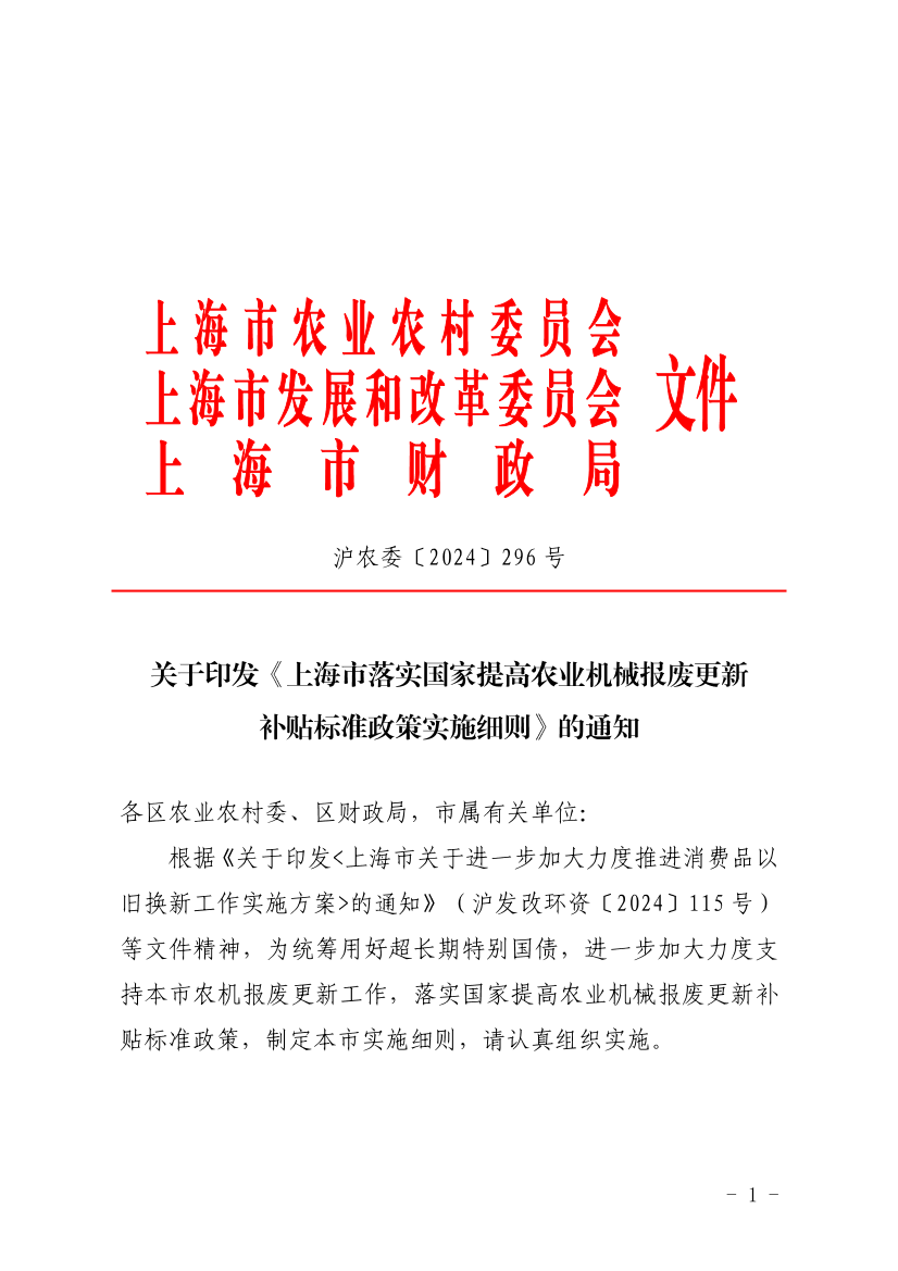 根据《关于印发<上海市关于进一步加大力度推进消费品以旧换新工作实施方案>的通知》(沪发改环资〔2024〕115号)等文件精神,为统筹用好超长期特别国债,进一步加大力度支持本市农机报废更新工作,落实国家提高农业机械报废更新补贴标准政策,制定本市实施细则,请认真组织实施。