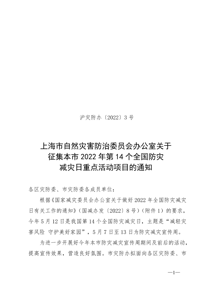 为进一步开展好今年本市防灾减灾宣传周期间及前后的活动,提高宣传效果,营造良好氛围。市灾防办拟面向各区灾防委、市灾防委成员单位等征集4-5月相关重点活动项目。请各单位认真填写“上海市2022年第14个全国防灾减灾日重点活动项目表”(附件2),并于3月18日(星期五)15时前,以传真或电子邮箱方式反馈至市灾防办。