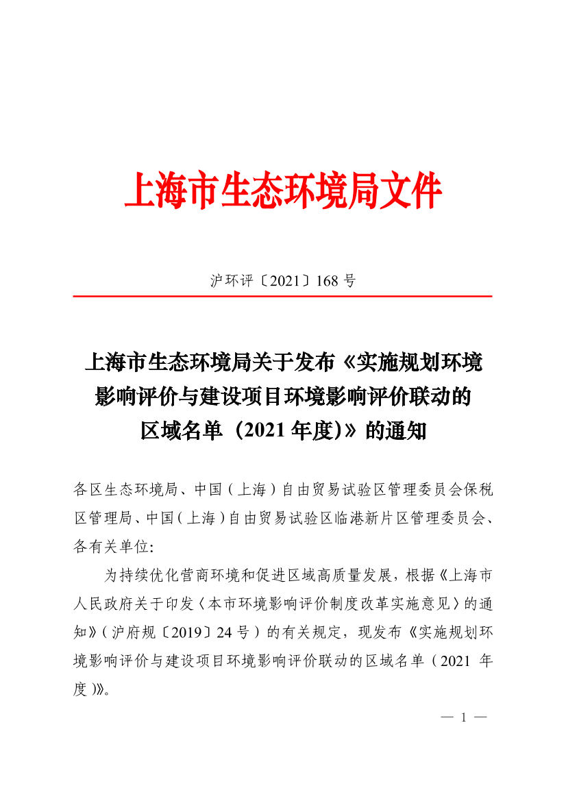 为持续优化营商环境和促进区域高质量发展,根据《上海市人民政府关于印发〈本市环境影响评价制度改革实施意见〉的通知》(沪府规〔2019〕24号)的有关规定,现发布《实施规划环境影响评价与建设项目环境影响评价联动的区域名单(2021年度)》。