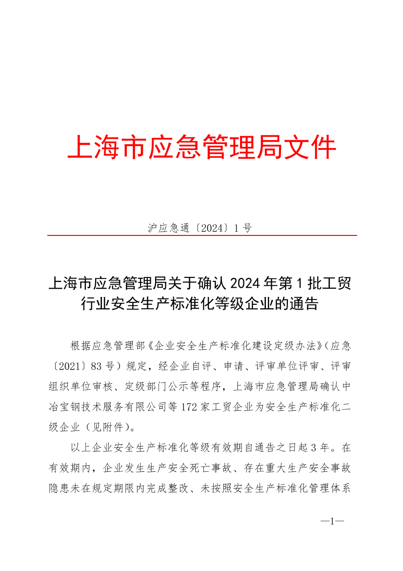 根据应急管理部《企业安全生产标准化建设定级办法》(应急〔2021〕83号)规定,经企业自评、申请、评审单位评审、评审组织单位审核、定级部门公示等程序,上海市应急管理局确认中冶宝钢技术服务有限公司等172家工贸企业为安全生产标准化二级企业(见附件)。