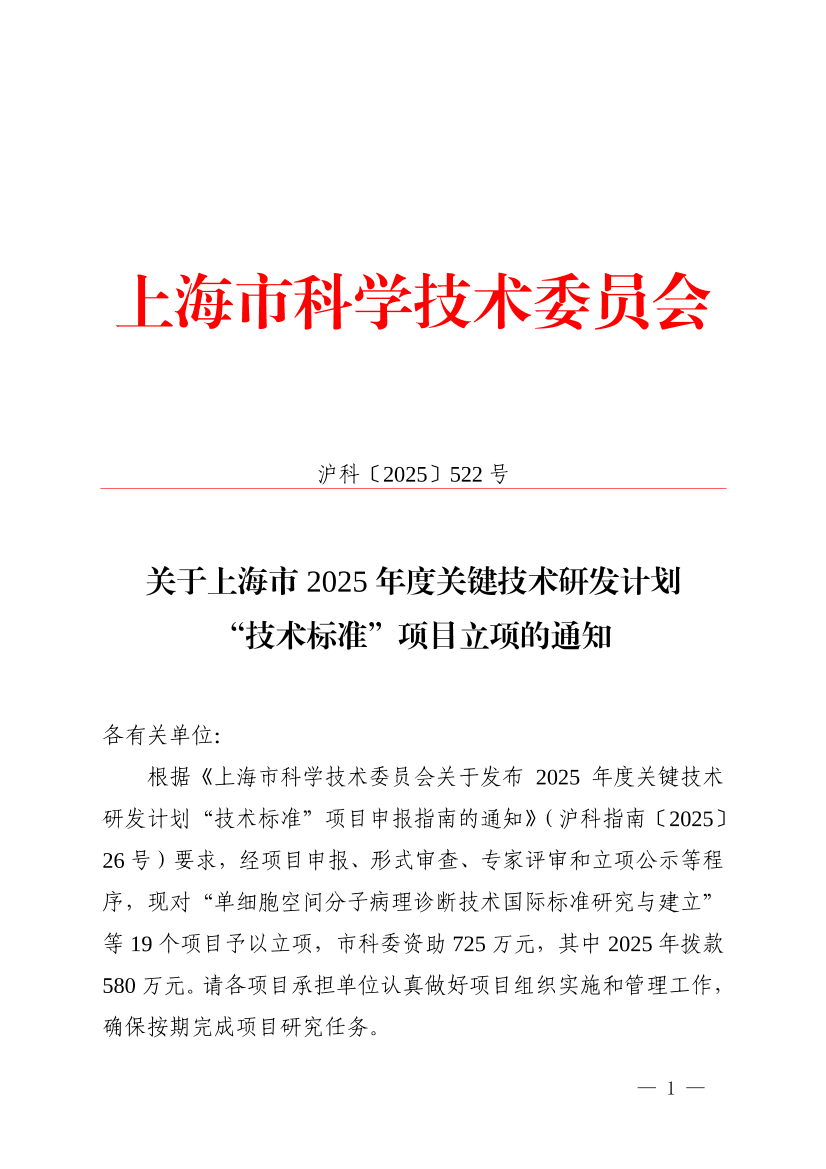 根据《上海市科学技术委员会关于发布2025年度关键技术研发计划“技术标准”项目申报指南的通知》(沪科指南〔2025〕26号)要求,经项目申报、形式审查、专家评审和立项公示等程序,现对“单细胞空间分子病理诊断技术国际标准研究与建立”等19个项目予以立项,市科委资助725万元,其中2025年拨款580万元。请各项目承担单位认真做好项目组织实施和管理工作,确保按期完成项目研究任务。