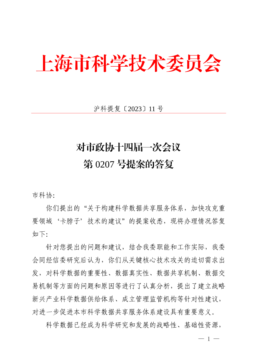 你们提出的“关于构建科学数据共享服务体系,加快攻克重要领域‘卡脖子’技术的建议”的提案收悉,现将办理情况答复如下:
