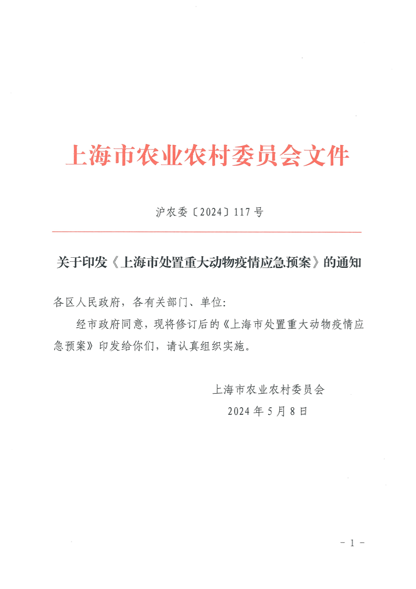 经市政府同意,现将修订后的《上海市处置重大动物疫情应急预案》印发给你们,请认真组织实施。