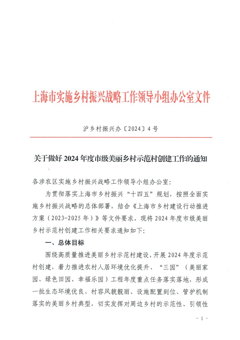 为贯彻落实上海市乡村振兴“十四五”规划,按照全面实施乡村振兴战略的总体部署,结合《上海市乡村建设行动推进方案(2023-2025年)》等文件要求,现将2024年度市级美丽乡村示范村创建工作相关要求通知如下: