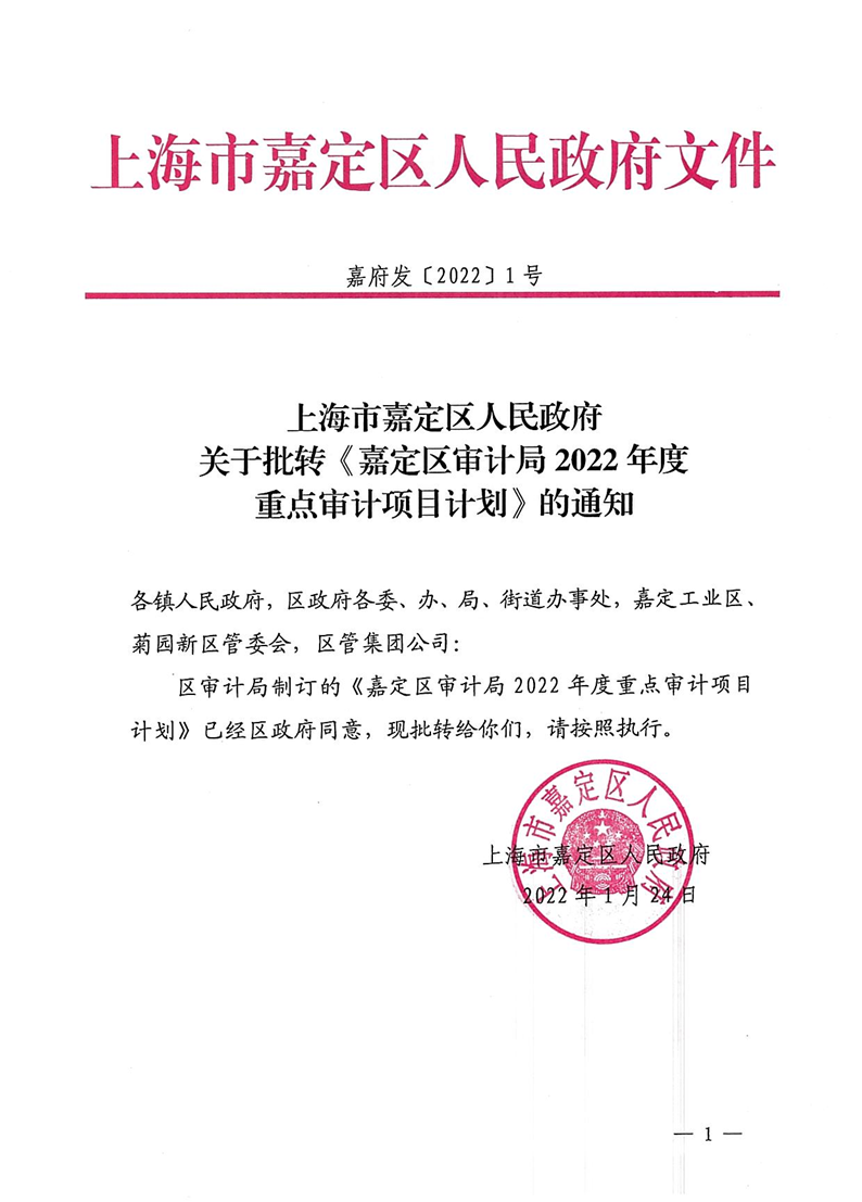 区审计局制订的《嘉定区审计局2022年度重点审计项目计划》已经区政府同意,现批转给你们,请按照执行。