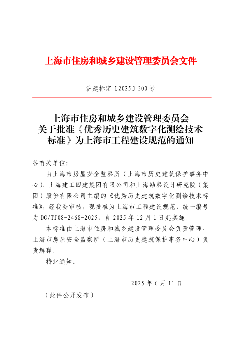 由上海市房屋安全监察所(上海市历史建筑保护事务中心)、上海建工四建集团有限公司和上海勘察设计研究院(集团)股份有限公司主编的《优秀历史建筑数字化测绘技术标准》,经我委审核,现批准为上海市工程建设规范,统一编号为DG/TJ08-2468-2025,自2025年12月1日起实施。