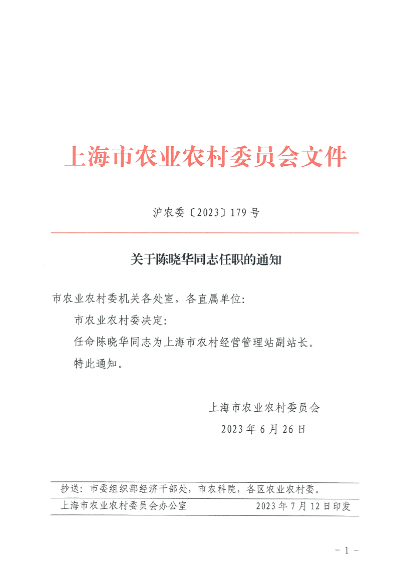 任命陈晓华同志为上海市农村经营管理站副站长。