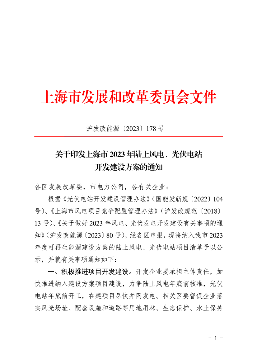 根据《光伏电站开发建设管理办法》(国能发新规〔2022〕104号)、《上海市风电项目竞争配置管理办法》(沪发改规范〔2018〕13号)、《关于做好2023年风电、光伏发电开发建设有关事项的通知》(沪发改能源〔2023〕80号),经各区申报,现将纳入我市2023年度可再生能源建设方案的陆上风电、光伏电站项目清单予以公示,并就有关事项通知如下: