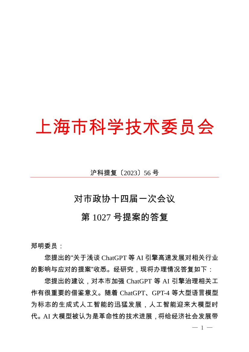 您提出的“关于浅谈ChatGPT等AI引擎高速发展对相关行业的影响与应对的提案”收悉。经研究,现将办理情况答复如下:
