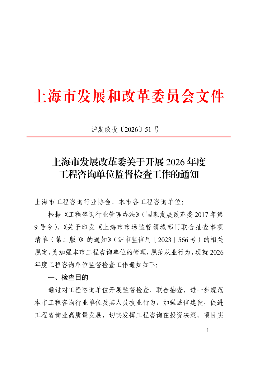 根据《工程咨询行业管理办法》(国家发展改革委2017年第9号令)、《关于印发《上海市市场监管领域部门联合抽查事项清单(第二版)》的通知》(沪市监信用[2023]566号)的相关规定,为加强本市工程咨询单位的管理,规范从业行为,现就2026年度工程咨询单位监督检查工作通知如下: