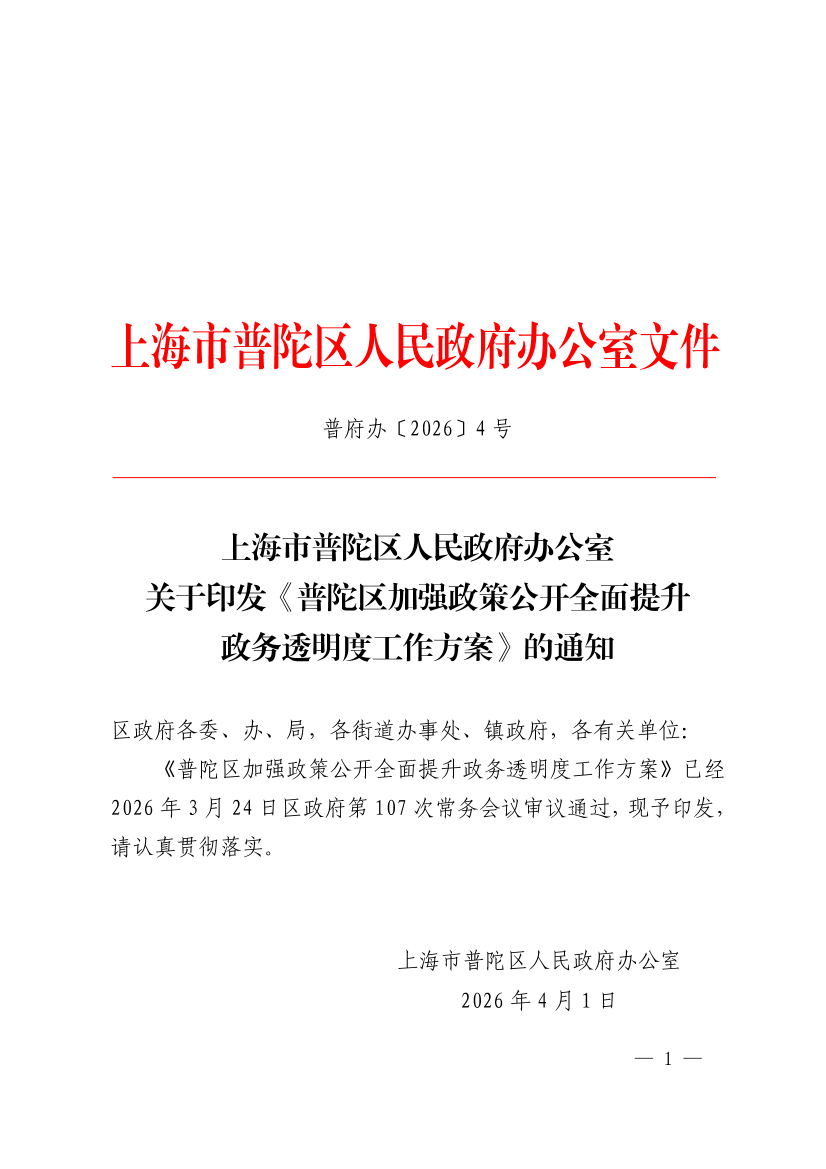 《普陀区加强政策公开全面提升政务透明度工作方案》已经2026年3月24日区政府第107次常务会议审议通过,现予印发,请认真贯彻落实。