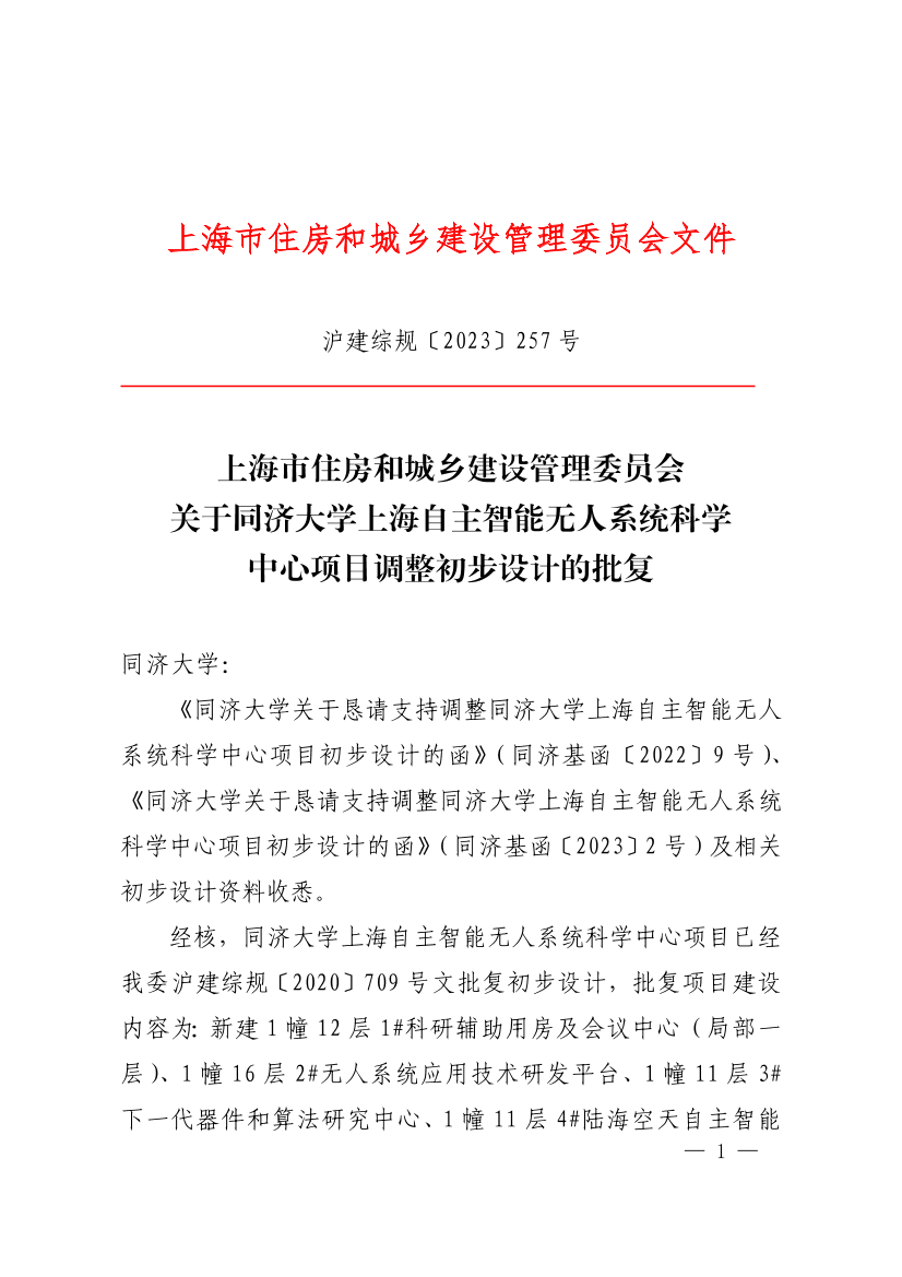 《同济大学关于恳请支持调整同济大学上海自主智能无人系统科学中心项目初步设计的函》(同济基函〔2022〕9号)、《同济大学关于恳请支持调整同济大学上海自主智能无人系统科学中心项目初步设计的函》(同济基函〔2023〕2号)及相关初步设计资料收悉。