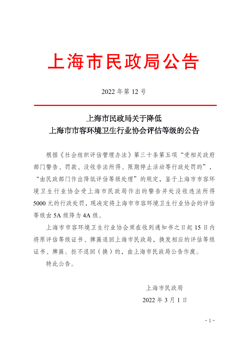 根据《社会组织评估管理办法》第三十条第五项“受相关政府部门警告、罚款、没收非法所得、限期停止活动等行政处罚的”,“由民政部门作出降低评估等级处理”的规定,鉴于上海市市容环境卫生行业协会受上海市民政局作出的警告并处没收违法所得5000元的行政处罚,现决定将上海市市容环境卫生行业协会的评估等级由5A级降为4A级。