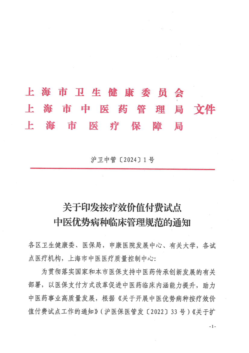 为贯彻落实国家和本市医保支持中医药传承创新发展的有关部署,以医保支付方式改革促进中医药临床内涵能力提升,助力中医药事业高质量发展,根据《关于开展中医优势病种按疗效价值付费试点工作的通知》(沪医保医管发〔2022〕33号)《关于扩大中医优势病种按疗效价值付费试点范围的通知》(沪医保医管发〔2024〕1号)等要求,市卫生健康委、市中医药管理局会同市医保局组织专家研究制定了《试点中医优势病种临床管理规范(第一版)》(以下简称《管理规范》)。现将文件印发给你们,并提出如下要求: