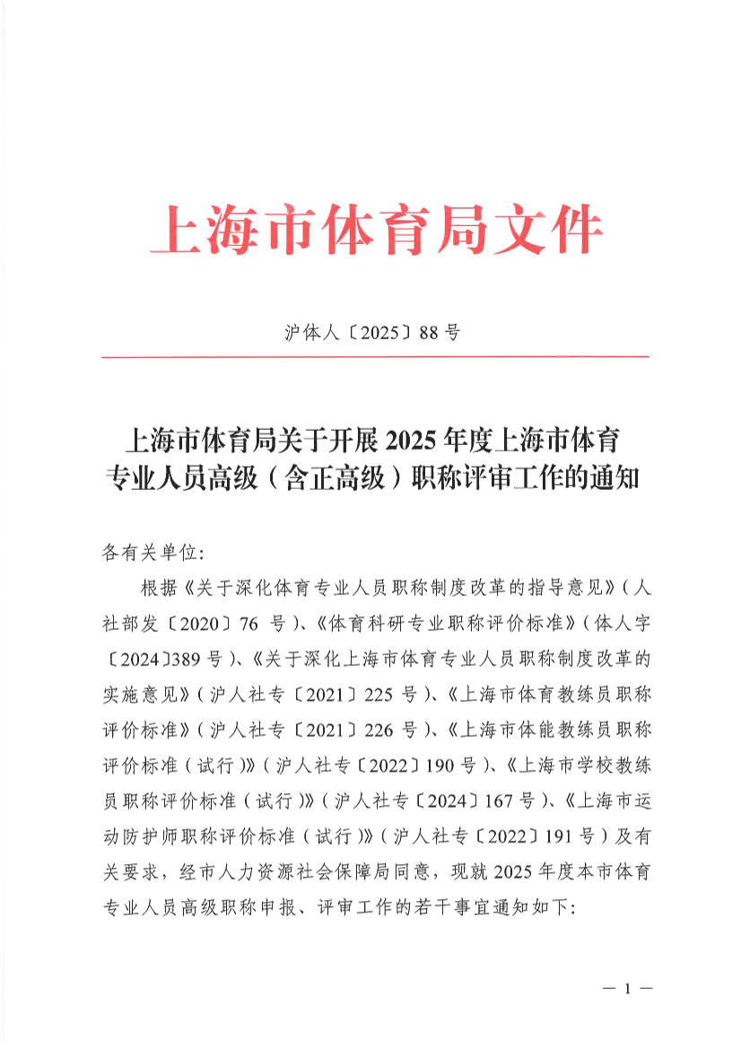根据《关于深化体育专业人员职称制度改革的指导意见》(人社部发〔2020〕76号)、《体育科研专业职称评价标准》(体人字〔2024〕389号)、《关于深化上海市体育专业人员职称制度改革的实施意见》(沪人社专〔2021〕225号)、《上海市体育教练员职称评价标准》(沪人社专〔2021〕226号)、《上海市体能教练员职称评价标准(试行)》(沪人社专〔2022〕190号)、《上海市学校教练员职称评价标准(试行)》(沪人社专〔2024〕167号)、《上海市运动防护师职称评价标准(试行)》(沪人社专〔2022〕191号)及有关要求,经市人力资源社会保障局同意,现就2025年度本市体育专业人员高级职称申报、评审工作的若干事宜通知如下:
