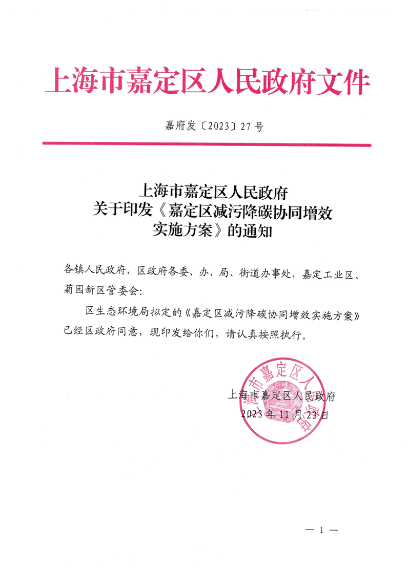 区生态环境局拟定的《嘉定区减污降碳协同增效实施方案》已经区政府同意,现印发给你们,请认真按照执行。
