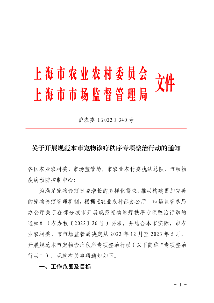 为满足宠物诊疗日益增长的多样化需求,推动构建更加完善的宠物诊疗管理机制,根据《农业农村部办公厅 市场监管总局办公厅关于在部分城市开展规范宠物诊疗秩序专项整治行动的通知》(农办牧〔2022〕26号)要求,并结合本市实际,市农业农村委、市市场监管局决定从2022年12月至2023年5月,开展规范本市宠物诊疗秩序专项整治行动(以下简称“专项整治行动”)。现就有关事项通知如下。