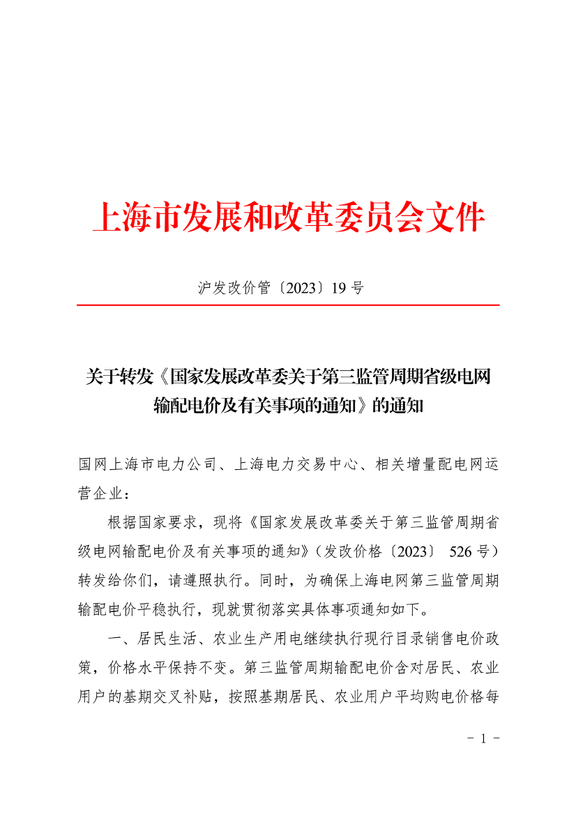 根据国家要求,现将《国家发展改革委关于第三监管周期省级电网输配电价及有关事项的通知》(发改价格〔2023〕 526号)转发给你们,请遵照执行。同时,为确保上海电网第三监管周期输配电价平稳执行,现就贯彻落实具体事项通知如下。