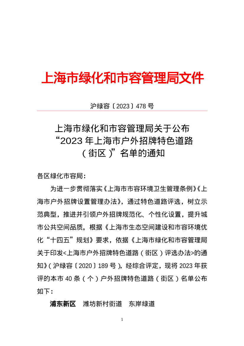 为进一步贯彻落实《上海市市容环境卫生管理条例》《上海市户外招牌设置管理办法》,通过特色道路评选,树立示范典型,推进并引领户外招牌规范化、个性化设置,提升城市公共空间品质。根据《上海市生态空间建设和市容环境优化“十四五”规划》要求,依据《上海市绿化和市容管理局关于印发<上海市户外招牌特色道路(街区)评选办法>的通知》(沪绿容〔2020〕189号),经综合评定,现将 2023年获评的本市 40条(个)户外招牌特色道路(街区)名单公布如下: