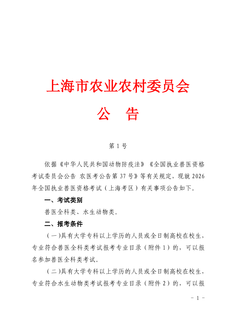 依据《中华人民共和国动物防疫法》《全国执业兽医资格考试委员会公告 农医考公告第37号》等有关规定,现就2026年全国执业兽医资格考试(上海考区)有关事项公告如下。