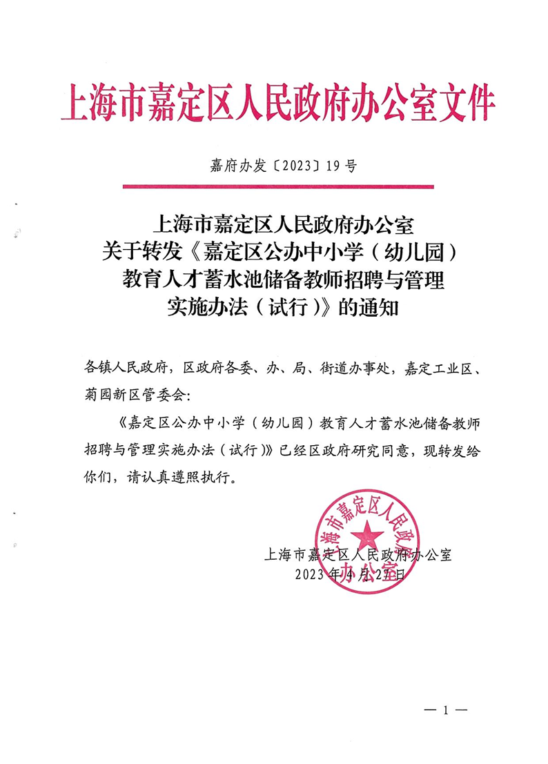 嘉定区公办中小学(幼儿园)教育人才蓄水池储备教师招聘与管理实施办法(试行)