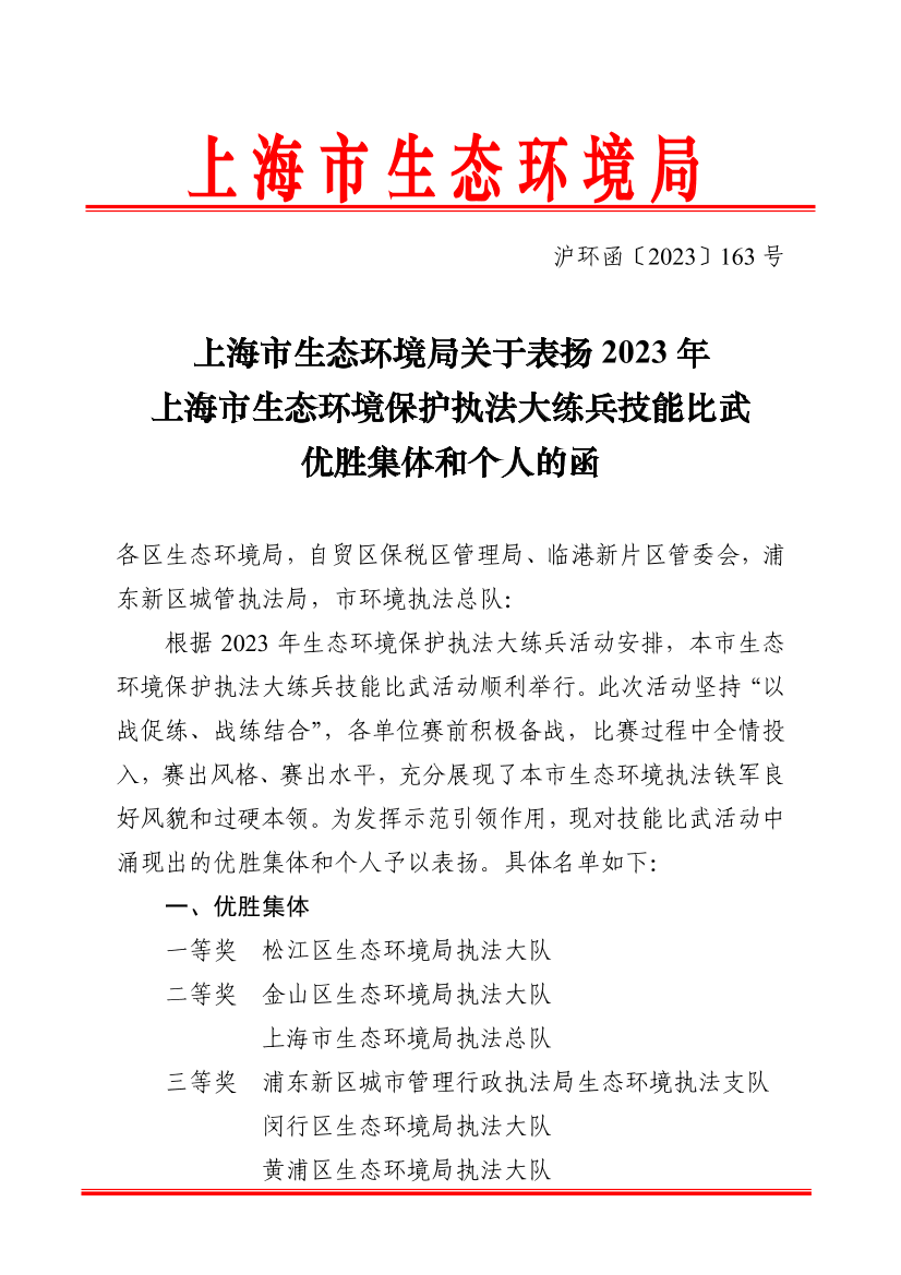 根据2023年生态环境保护执法大练兵活动安排,本市生态环境保护执法大练兵技能比武活动顺利举行。此次活动坚持“以战促练、战练结合”,各单位赛前积极备战,比赛过程中全情投入,赛出风格、赛出水平,充分展现了本市生态环境执法铁军良好风貌和过硬本领。为发挥示范引领作用,现对技能比武活动中涌现出的优胜集体和个人予以表扬。具体名单如下: